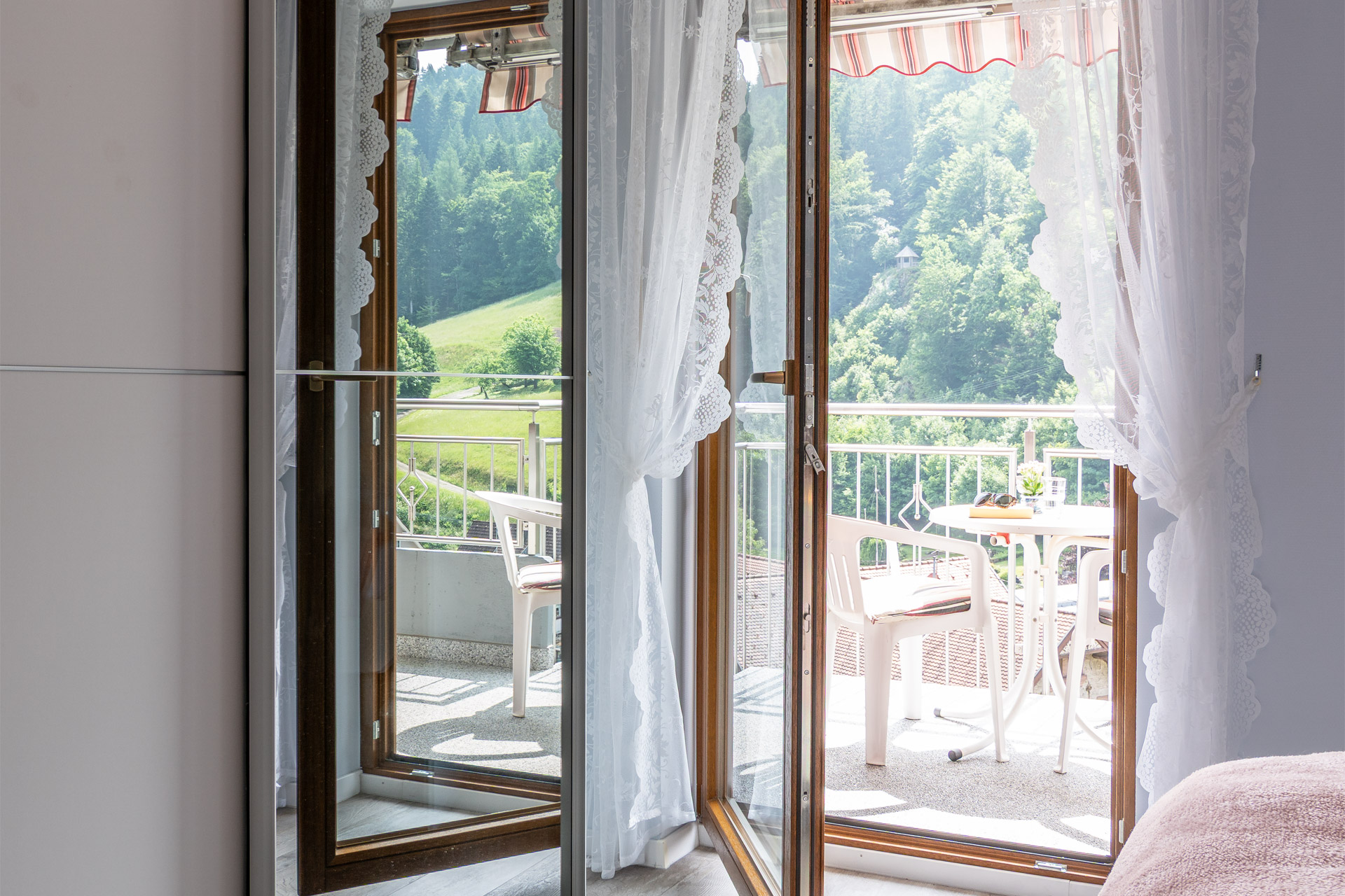 Der großzügige Balkon ist mehr als nur ein Platz im Freien – er ist Ihre kleine Loge mit Blick ins obere Wolftal. Ob zum Frühstück, zum Lesen oder einfach zum Stillsein: Hier lässt sich der Tag in aller Ruhe beginnen oder ausklingen. Bequeme Gartenmöbel, zwei Klappstühle und eine ausziehbare Markise sorgen dafür, dass Sie sich zu jeder Tageszeit wohlfühlen – auch wenn die Sonne es einmal zu gut meint.