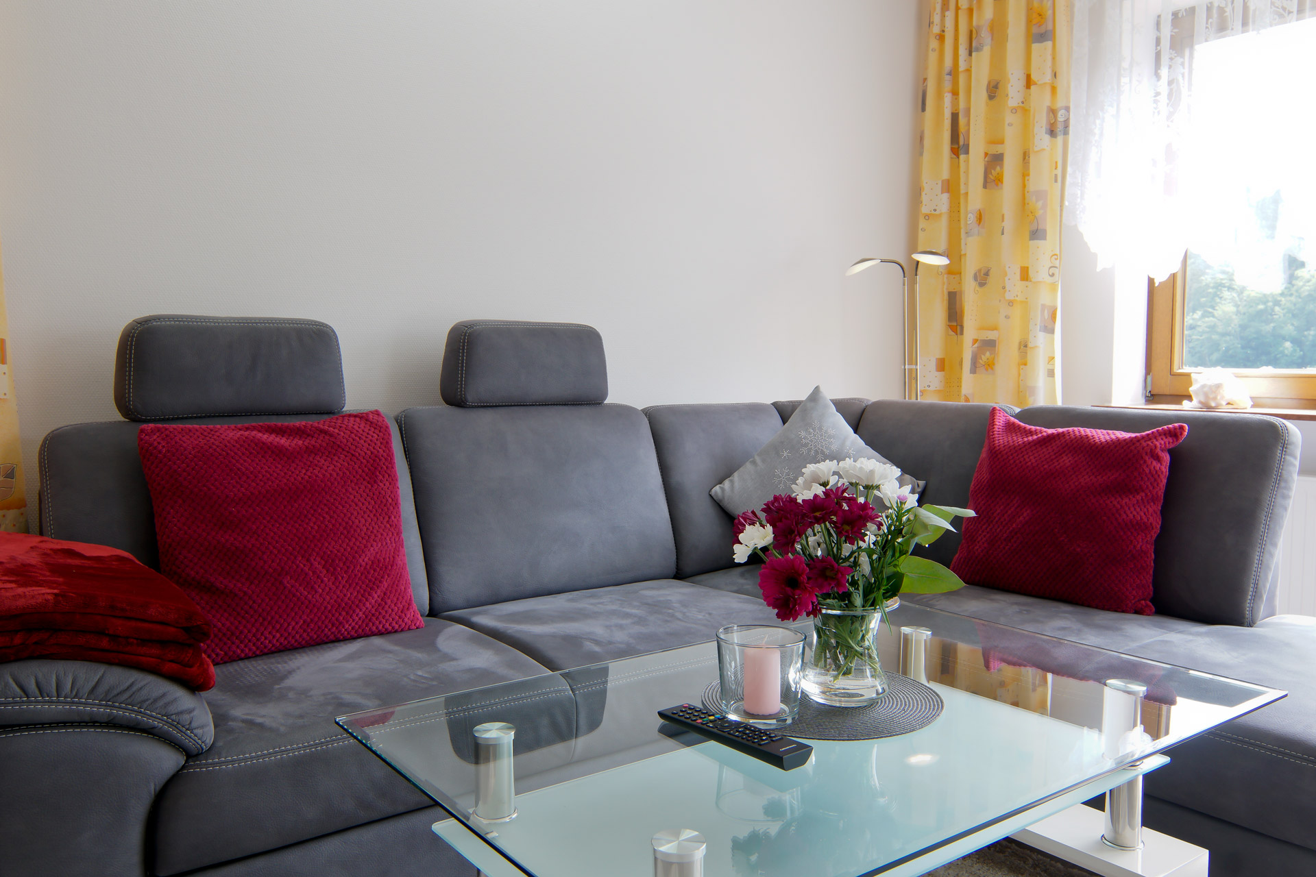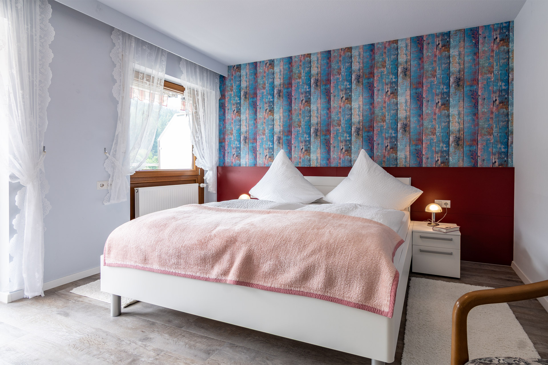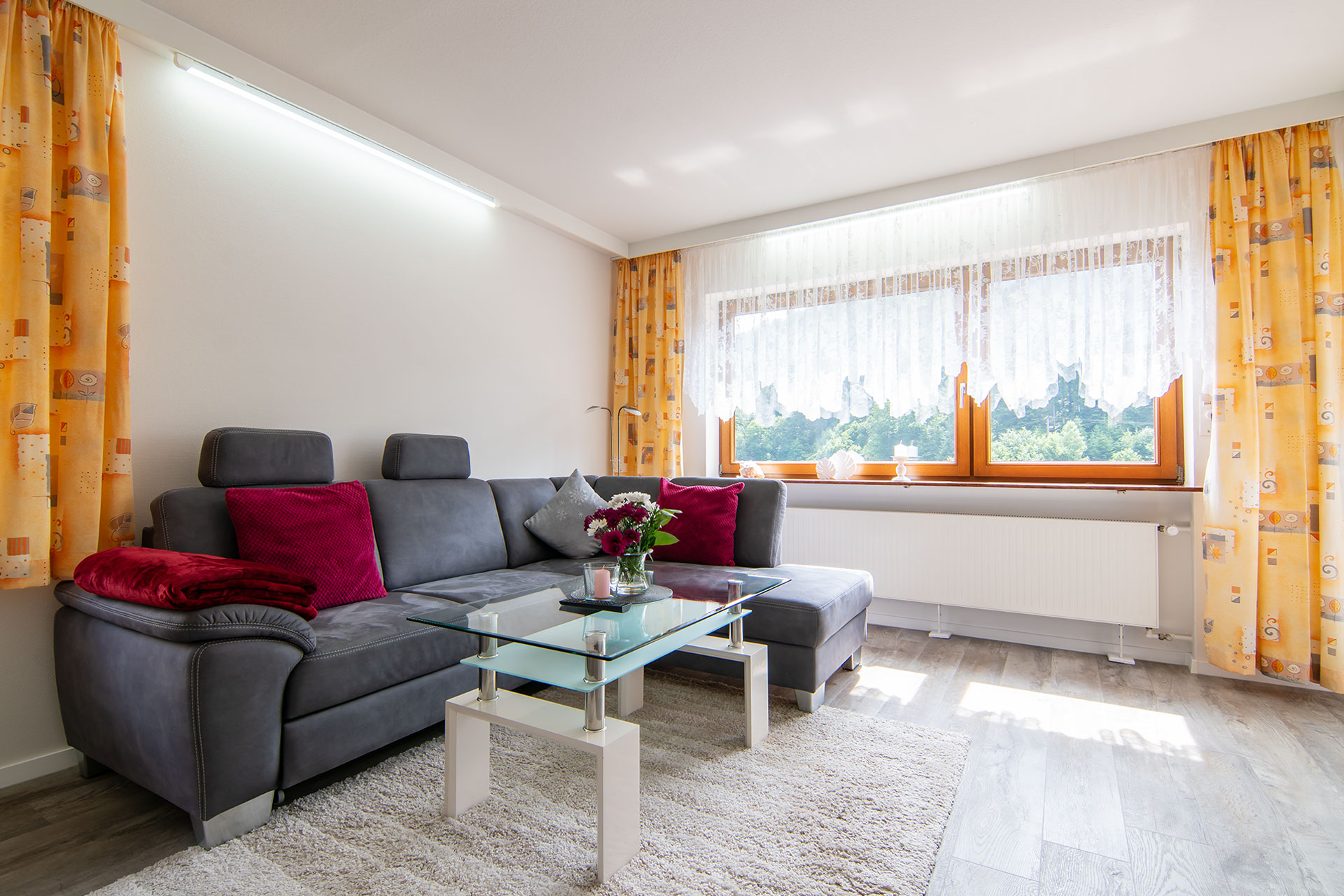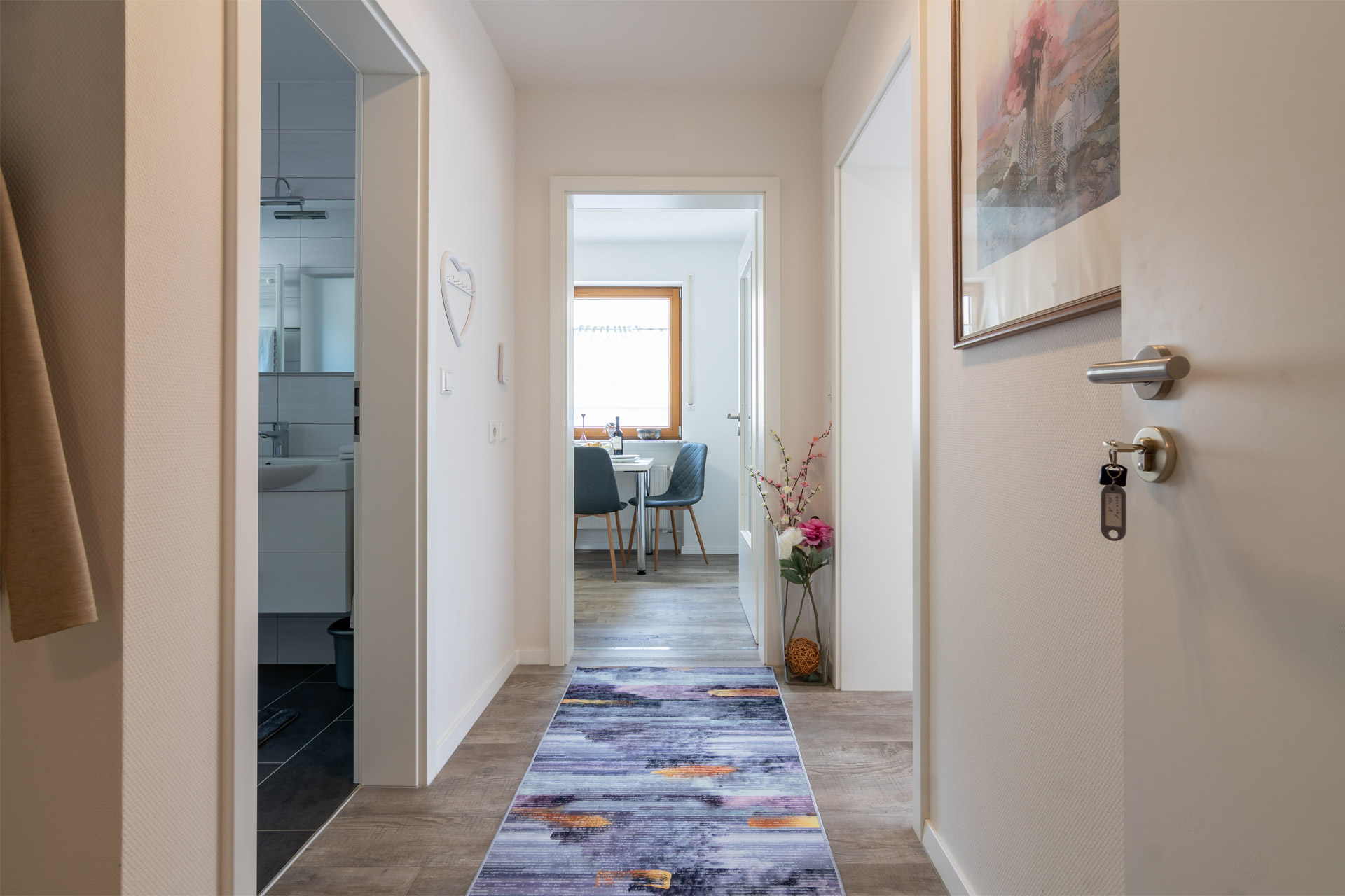Die Ferienwohnung Talblick bietet auf 65 m² Platz für bis zu 3 Personen. Vom Balkon blicken Sie weit ins Tal, während innen warme Farben und natürliche Materialien eine behagliche Atmosphäre schaffen. Ob beim Frühstück mit Aussicht auf dem Balkon oder nach einer Wanderung auf gemütlichen Sofa – hier fällt das Ankommen leicht.