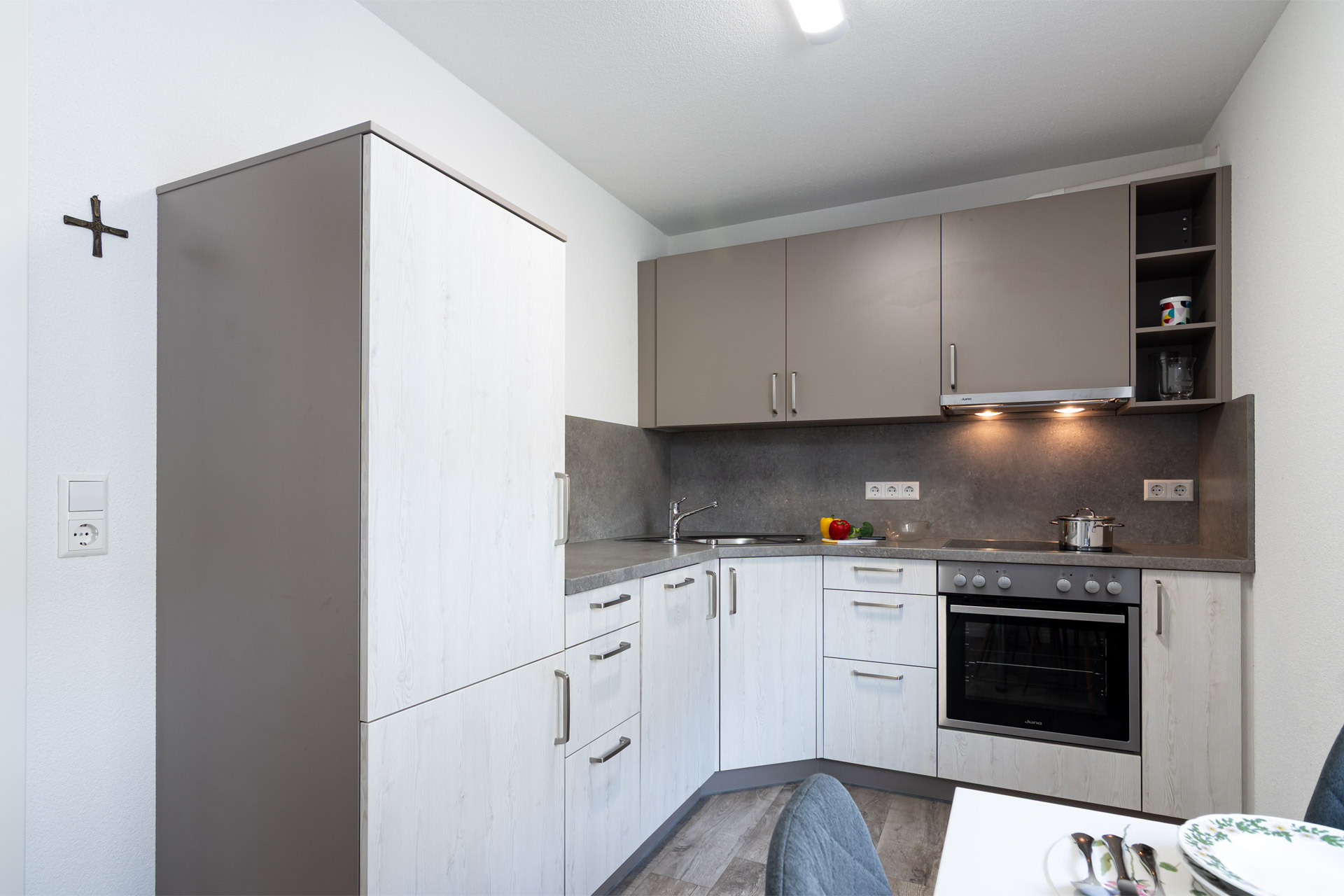 Voll ausgestattet – mit allem, was Sie für ein gemütliches Frühstück oder eine kleine Mahlzeit zwischendurch brauchen. Der Esstisch bietet Platz für zwei, bei schönem Wetter zieht es Sie vielleicht mit einem frischen Brötchen und einer Tasse Kaffee direkt auf den Balkon. Alles Weitere gibt’s im Lädele im Ort – gut zu Fuß erreichbar.