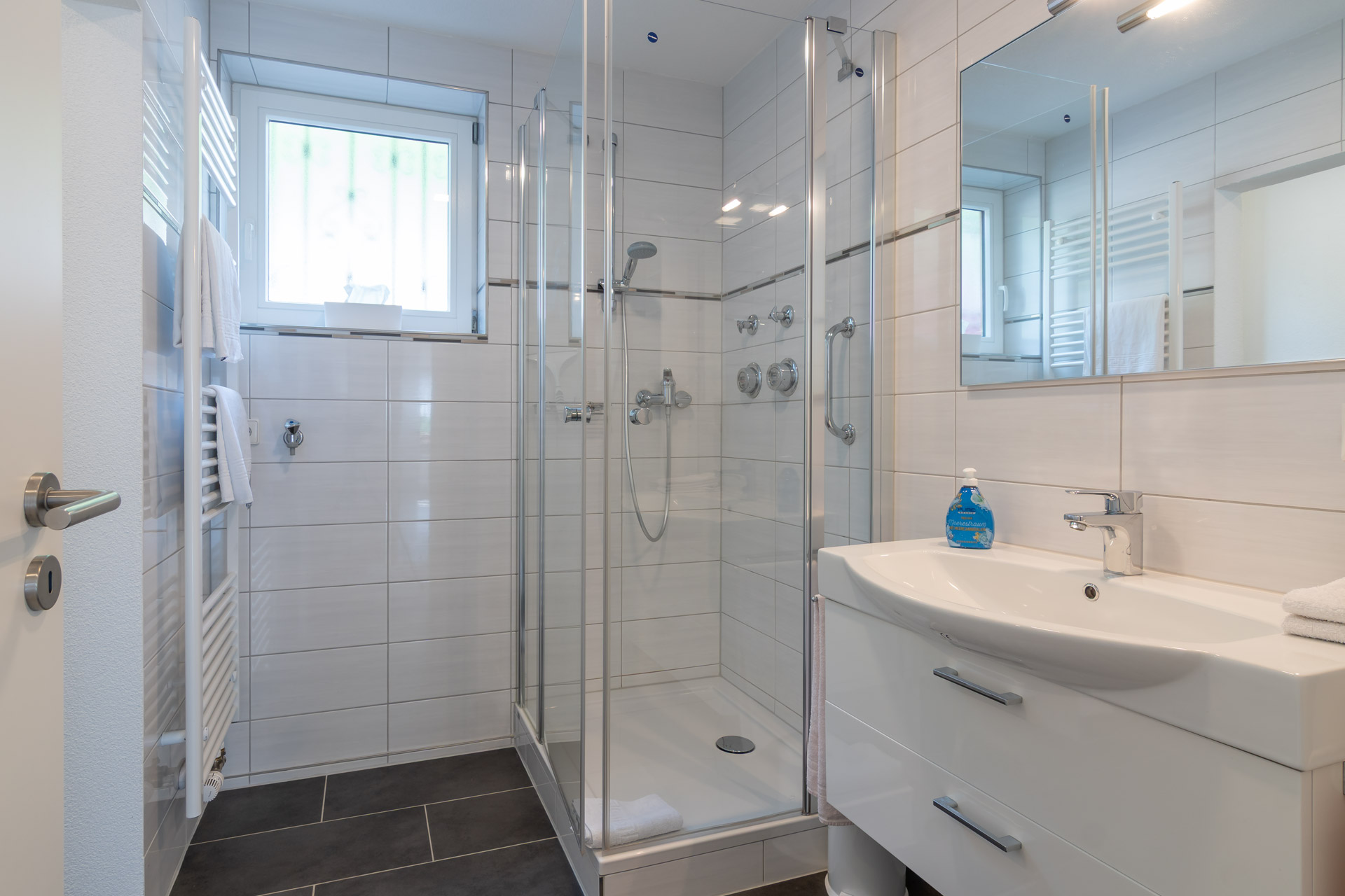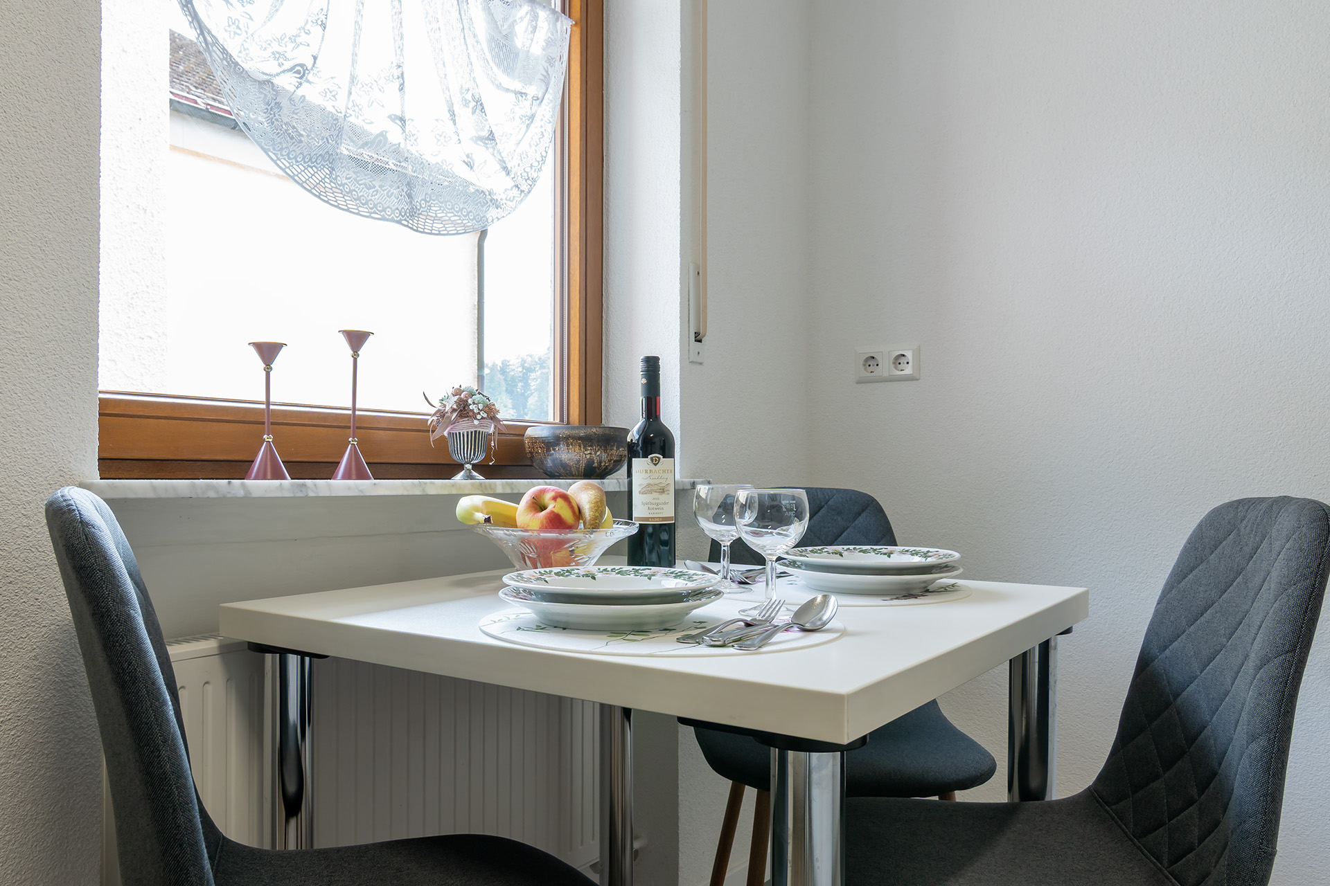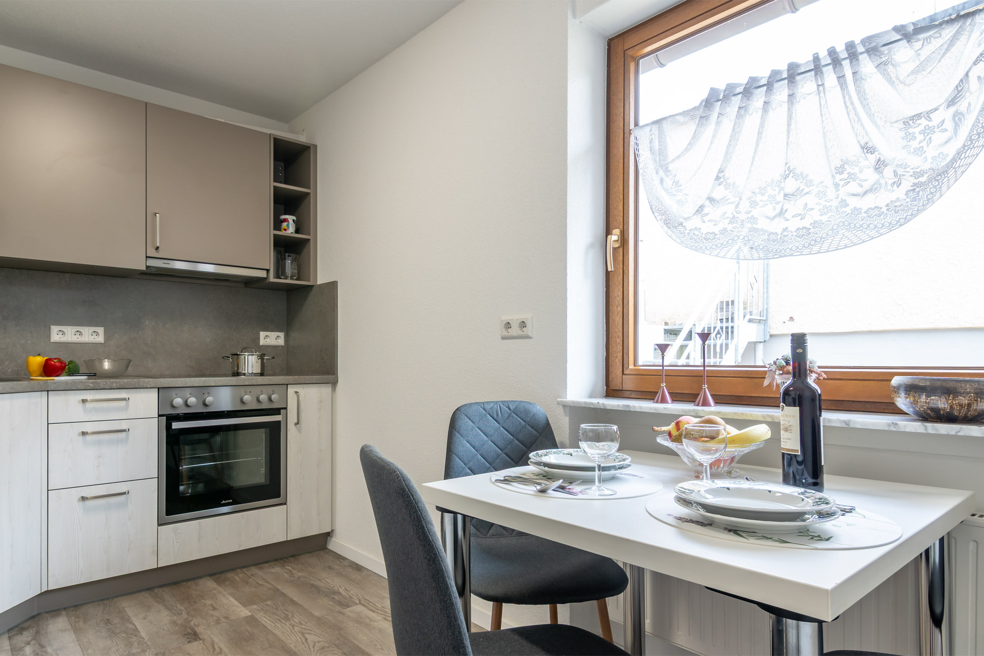 Voll ausgestattet – mit allem, was Sie für ein gemütliches Frühstück oder eine kleine Mahlzeit zwischendurch brauchen. Der Esstisch bietet Platz für zwei, bei schönem Wetter zieht es Sie vielleicht mit einem frischen Brötchen und einer Tasse Kaffee direkt auf den Balkon. Alles Weitere gibt’s im Lädele im Ort – gut zu Fuß erreichbar.
