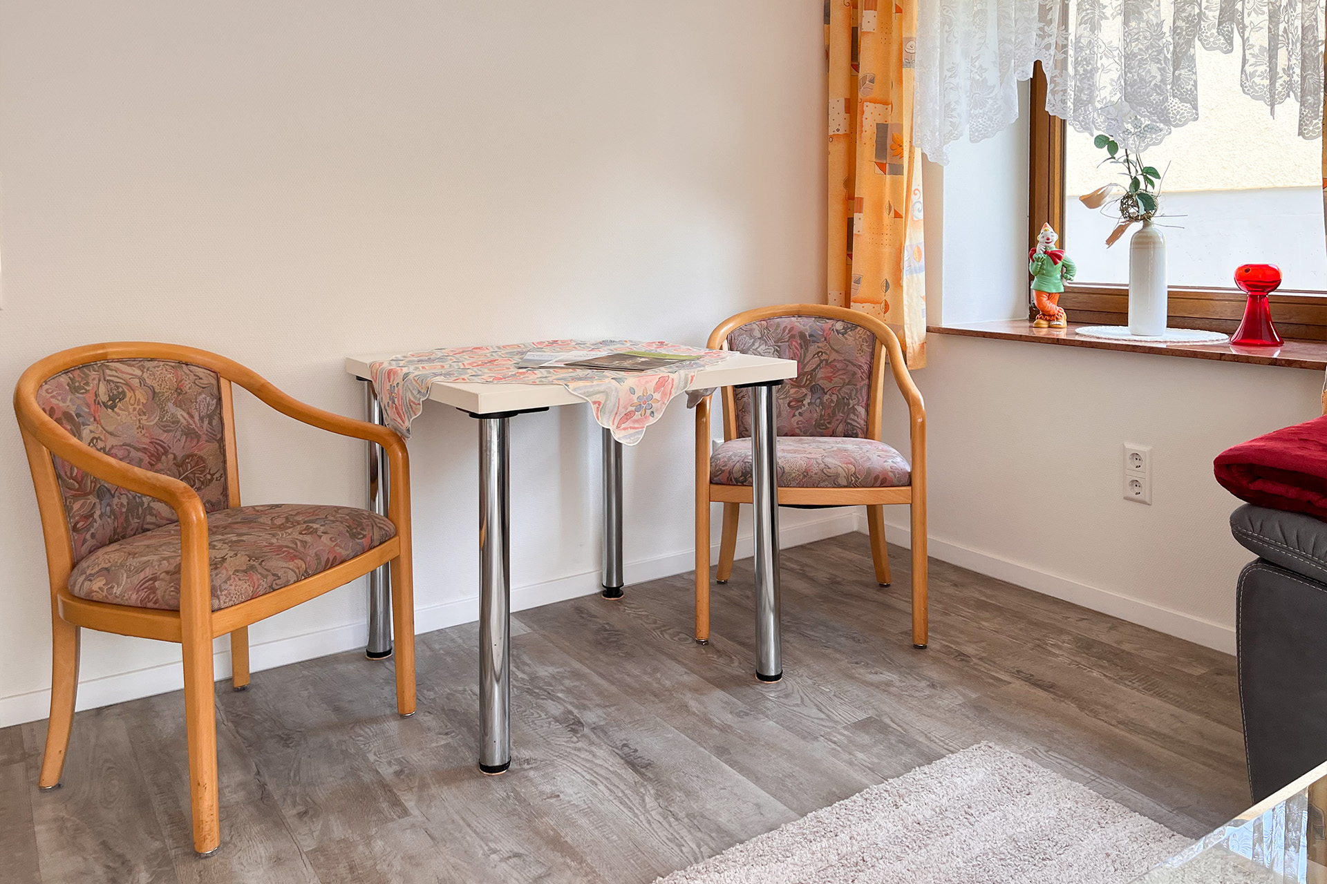 Der großzügige Balkon ist mehr als nur ein Platz im Freien – er ist Ihre kleine Loge mit Blick ins obere Wolftal. Ob zum Frühstück, zum Lesen oder einfach zum Stillsein: Hier lässt sich der Tag in aller Ruhe beginnen oder ausklingen. Bequeme Gartenmöbel, zwei Klappstühle und eine ausziehbare Markise sorgen dafür, dass Sie sich zu jeder Tageszeit wohlfühlen – auch wenn die Sonne es einmal zu gut meint.